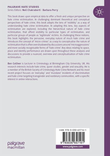 This book draws upon empirical data to offer a fresh and unique perspective on hate crime victimisation, using transphobic hate crime as a case study. It adopts the lens of 'visibility' as a way of understanding hate crime victimisation and to challenge dominant theoretical and conceptual perspectives of hate crime. In adopting this lens, key aspects of victimisation are explored, including the hierarchical nature of hate crime victimisation that afford visibility to particular types of victimisation and to particular groups of people to make them 'legitimate' victims. In challenging these notions, this book highlights the pervasive, everyday nature of much hate crime and introduces the concept of 'micro-crimes' as a way to conceptualise the nature of victimisation that is often overshadowed by discussions around 'microaggressions' and more socially recognisable forms of 'hate crime'. Key ideas relating to space, place and identity performance are drawn upon throughout these analyses and discussions to provide a nuanced overview and conceptualisation of hate crime victimisation.