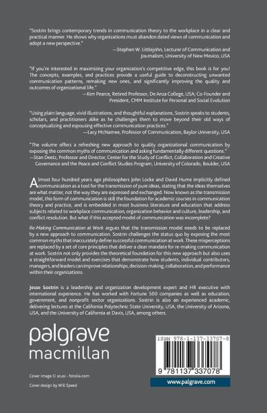 "Re-Making Communication at Work offers a clear and compelling alternative to the transmission model of communication that is so deeply entrenched in our theories of organizational communication. Using plain language, vivid illustrations, and thoughtful explanation, Sostrin speaks to students, scholars and practitioners alike as he challenges them to move beyond their old ways of conceptualizing and espousing effective communication practices." - Lacy McNamee, Professor of Communication, Baylor University,USA