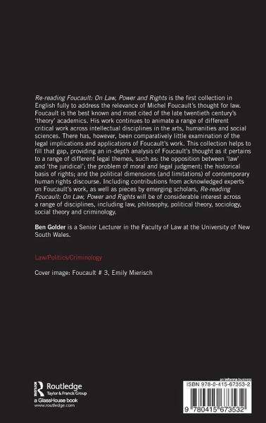 Re-reading Foucault: On Law, Power and Rights is the first collection in English fully to address the relevance of Michel Foucault's thought for law. Foucault is the best known and most cited of the late twentieth-century's 'theory' academics. His work continues to animate a range of different critical work across intellectual disciplines in the arts, humanities and social sciences. There has, however, been relatively little examination of the legal implications and applications of Foucault's work. This book fills that gap, providing an in-depth analysis of Foucault's thought as it pertains to a range of different legal themes, such as: the opposition between 'law' and 'the juridical'; the problem of moral and legal judgment; the historical basis of rights; and the political dimensions (and limitations) of contemporary human rights discourse. Including contributions from acknowledged experts on Foucault's work, as well as pieces by younger scholars, Re-reading Foucault: On Law, Power and Rights will be of considerable interest across a range of disciplines, including law, philosophy, political theory, sociology, social theory and criminology.