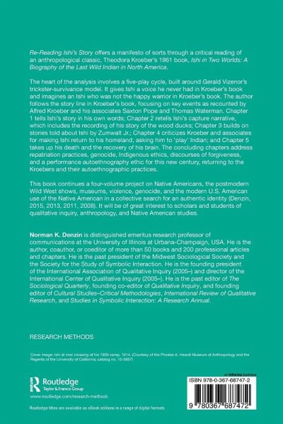 Rereading Ishi's Story offers a manifesto of sorts through a critical reading of an anthropological classic, Theodora Kroeber's 1961 book, Ishi in Two Worlds: A Biography of the Last Wild Indian in North America. The heart of the analysis involves a five-play cycle, built around Gerald Vizenor's trickster-survivance model. It gives Ishi a voice he never had in Kroeber's book and imagines an Ishi who was not the happy warrior in Kroeber's book. The author follows the story line in Kroeber's book, focusing on key events as recounted by Alfred Kroeber and his associates Saxton Pope and Thomas Waterman. Chapter 1 tells Ishi's story in his own words; Chapter 2 retells Ishi's capture narrative, which includes the recording of his story of the wood ducks; Chapter 3 builds on stories told about Ishi by Zumwalt Jr.; Chapter 4 criticizes Kroeber and associates for making Ishi return to his homeland, asking him to 'play' Indian; and Chapter 5 takes up his death and the recovery of his brain. The concluding chapters address repatriation practices, genocide, Indigenous ethics, discourses of forgiveness, and a performance autoethnography ethic for this new century, returning to the Kroebers and their autoethnographic practices. This book continues a four-volume project on Native Americans, the postmodern Wild West shows, museums, violence, genocide, and the modern U.S. American use of the Native American in a collective search for an authentic identity (Denzin, 2015, 2013, 2011, 2008). It will be of great interest to scholars and students of qualitative inquiry, anthropology, and Native American studies.