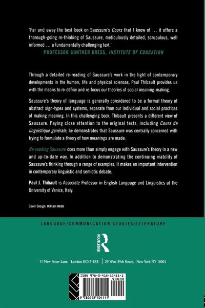 Through a detailed re-reading of Saussures's work in the light of contemporary developments in the human, life and physical sciences, Paul Thibault provides us with the means to redefine and refocus our theories of social meaning-making. Saussure's theory of language is generally considered to be a formal theory of abstract sign-types and sign-systems, separate from our individual and social practices of making meaning. In this challenging book, Thibault presents a different view of Saussure. Paying close attention to the original texts, including the Cours de Linguistic Generale he demonstrates that Saussure was centrally concerned with trying to formulate a theory of how meanings are made.Re-reading Saussure does more than simply engage with Saussure's theory in a new and up-to-date way, however. In addition to demonstrating the continuing viability of Saussure's thinking through a range of examples, it makes an important intervention in contemporary linguistic and semiotic debate.