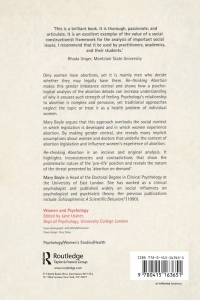 Women have been able to have abortions legally for over 30 years. Yet few books have considered it as anything other than a health issue. Mary Boyle breaks this mould by considering the constructions of abortion in Western society. Drawing on ideas from sociology, politics, anthropology and law as well as psychology, she shows how abortion is linked to sexual behaviour and motherhood in the complex web of gender and power relations. This book will be of interest to all those engaged with feminist thinking, whether as student, academic, or professional in practice.
