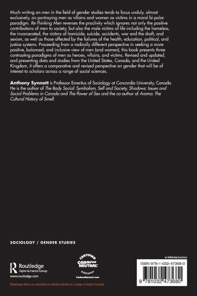 Much writing on men in the field of gender studies tends to focus unduly, almost exclusively, on portraying men as villains and women as victims in a moral bi-polar paradigm. Re-Thinking Men reverses the proclivity which ignores not only the positive contributions of men to society, but also the male victims of life including the homeless, the incarcerated, the victims of homicide, suicide, accidents, war and the draft, and sexism, as well as those affected by the failures of the health, education, political, and justice systems. Proceeding from a radically different perspective in seeking a more positive, balanced, and inclusive view of men (and women), this book presents three contrasting paradigms of men as heroes, villains, and victims. Revised and updated, and presenting data and studies from the United States, Canada, and the United Kingdom, it offers a comparative and revised perspective on gender that will be of interest to scholars across a range of social sciences.