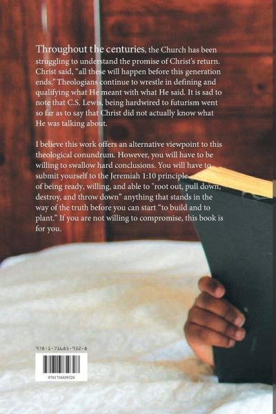 Throughout the centuries, the Church has been struggling to understand the promise of Christ's return. Christ said, "all these will happen before this generation ends." Theologians continue to wrestle in defining and qualifying what He meant with what He said. It is sad to note that C.S. Lewis, being hardwired to futurism went so far as to say that Christ did not actually know what He was talking about. I believe this work offers an alternative solution to this theological conundrum. However, you will have to be willing to swallow hard conclusions. You will have to submit yourself to the Jeremiah 1:10 principle of being able, ready, and willing to "root out, pull down, destroy, and throw down" anything that stands in the way of the truth before you can start "to build and to plant." If you are not willing to compromise, this book is for you.