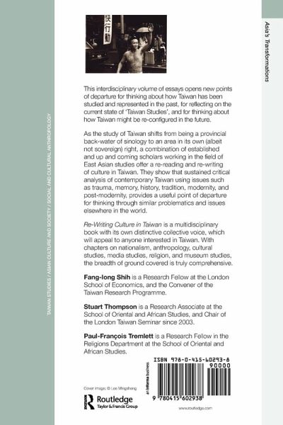 This inter-disciplinary volume of essays opens new points of departure for thinking about how Taiwan has been studied and represented in the past, for reflecting on the current state of 'Taiwan Studies', and for thinking about how Taiwan might be re-configured in the future. As the study of Taiwan shifts from being a provincial back-water of sinology to an area in its own (albeit not sovereign) right, a combination of established and up and coming scholars working in the field of East Asian studies offer a re-reading and re-writing of culture in Taiwan. They show that sustained critical analysis of contemporary Taiwan using issues such as trauma, memory, history, tradition, modernity, post-modernity provides a useful point of departure for thinking through similar problematics and issues elsewhere in the world. Re-writing Culture in Taiwan is a multidisciplinary book with its own distinctive collective voice which will appeal to anyone interested in Taiwan. With chapters on nationalism, anthropology, cultural studies, media studies, religion and museum studies, the breadth of ground covered is truly comprehensive.