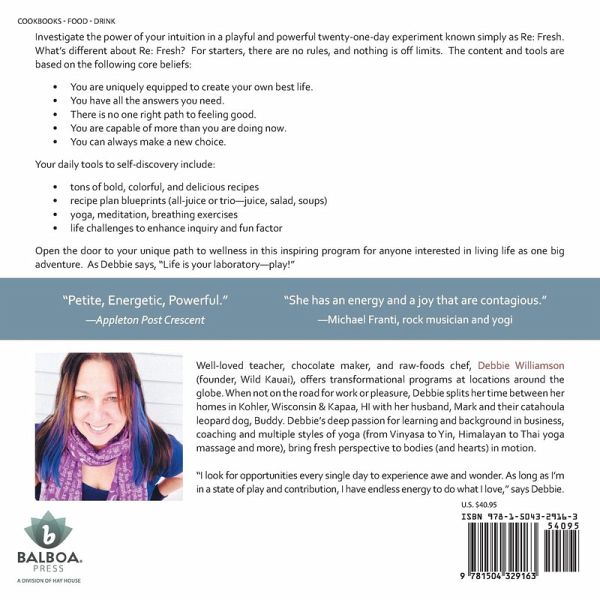 Investigate the power of your intuition in a playful and powerful twenty-one-day experiment known simply as Re: Fresh. What's different about Re: Fresh? For starters, there are no rules, and nothing is off limits. The content and tools are based on the following core beliefs: • You are uniquely equipped to create your own best life. • You have all the answers you need. • There is no one right path to feeling good. • You are capable of more than you are doing now. • You can always make a new choice. Your daily tools to self-discovery include: • tons of bold, colorful, and delicious recipes • recipe plan blueprints (all-juice or trio-juice, salad, soups) • yoga, meditation, breathing exercises • life challenges to enhance inquiry and fun factor Open the door to your unique path to wellness in this inspiring program for anyone interested in living life as one big adventure. As Debbie says, "Life is your laboratory-play!"
