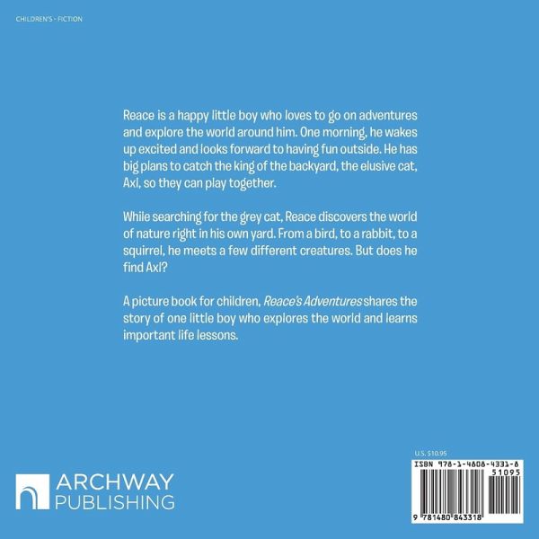 Reace is a happy little boy who loves to go on adventures and explore the world around him. One morning, he wakes up excited and looks forward to having fun outside. He has big plans to catch the king of the backyard, the elusive cat, Axl, so they can play together. While searching for the grey cat, Reace discovers the world of nature right in his own yard. From a bird, to a rabbit, to a squirrel, he meets a few different creatures. But does he find Axl? A picture book for children, Reace's Adventures shares the story of one little boy who explores the world and learns important life lessons.