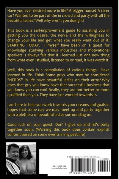 This book is a self-improvement guide to assisting you in getting you the desire, the nerve, and the willingness to change your life and get what you really want out of it! STARTING TODAY. I myself have been on a quest for knowledge studying various industries and motivational speakers. I always felt that if I learned just one new thing from what ever I studied, listened to, or read, it was worth it. Well, this book is a compilation of various things I have learned in life. Do you think some guys who may be considered "NERDS" in life have beautiful ladies on their arms? Why does that guy you know have that successful business that you know you can run? Really, they are not better or more qualified than you. They have just worked towards it. I am here to help you work towards your dreams and goals in hopes that some day we may meet up and party together with a plethora of beautiful ladies surrounding us. (Warning this book does contain profanity & explicit content based on some events in my past )