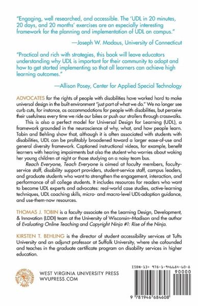 Includes resources for readers who want to become Universal Design for Learning (UDL) experts and advocates: case studies, active-learning techniques, UDL coaching skills, micro- and macro-level UDL-adoption guidance, and use-them-now resources. It is is aimed at faculty members, faculty-service staff, disability support providers, student-service staff, campus leaders, and graduate students.