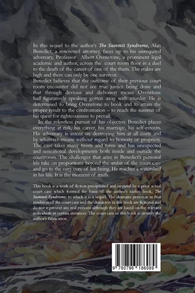 In this sequel to the author's The Summit Syndrome, Alan Benedict, a renowned attorney, faces up to his unrequited adversary, Professor Albert Ovenstone, a prominent legal academic and author, across thecourt room floor in a duel to the death of the career of one of the them. The stakes are high and there can only be one survivor. Benedict believes that the outcome of their previous court room encounter did not see true justice being done and that through devious and dishonest means Ovenstone had figuratively speaking gotten away with murder. He is determined to bring Ovenstone to book and to attain the proper result to the confrontation - to reach the summit of his quest for righteousness to prevail. In the relentless pursuit of his objective Benedict places everything at risk, his career, his marriage, his self-esteem. His adversary is intent on destroying him at all costs and by whatever means without regard to honesty or propriety. The case takes many twists and turns and has unexpected and sensational developments both inside and outside the courtroom. The challenges that arise in Benedict's personal life take on proportions beyond the ambit of the court case and go to the very core of his being. He reaches a watershed in his life. It is the moment of truth. He has to succeed to salvage his career and his personal life.