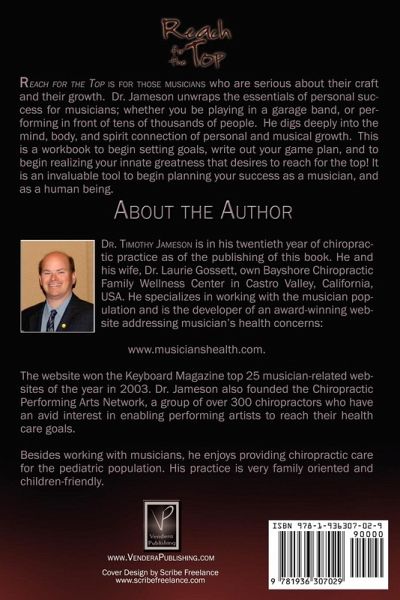 Reach for the Top: The Musician's Guide to Health, Wealth and Success by Dr. Timothy Jameson , (author of Repetitive Strain Injuries: Alternative Treatments and Prevention) is a book specifically geared towards helping any musician master their mental, physical and spiritual well-being... Are you considering a career as a musical artist? Are you a musician or vocalist reaching a plateau in your career? Do you have a nagging injury that is holding you back from excelling in your musicianship? Are you looking for the secret clues that the highly successful musicians already know? Then this is the book for you! This book is a summary of what Dr. Timothy Jameson has learned about the amazing attributes of the human mind, body, and soul over his 20+year career as a Doctor of Chiropractic and as a musician working week after week as a music director and worship pastor of his church. Dr. Jameson has spent many years working intimately with musicians, caring for human beings dealing with injuries, emotional stress, performance stress, and addictions. Through that time, Dr. Jameson has thoroughly enjoyed providing wellness enhancement, encouragement, and relief from debilitating injuries. This book was the result of one of my greatest joys; seeing a musician's career saved by chiropractic, and then allowed to flourish due to positive constructive coaching to work on the mental aspect of the game. Dr. Jameson says: I created this book in order that you can achieve a level of success that you only dreamed for your career. This book will set in motion your desires to reach the top! It is an action-oriented book that will guide you in your path to wholeness, wellness, and success. I believe it will be a workbook that you will keep in your travel bag, or next to your bed, so you can constantly revisit your goals, affirmations, and action steps to achieve the results you have desired for your life. I also created this book so that you can achieve a level of physical wellness that will allow you to perform music throughout your entire life. Musicians must care for their bodies to engage in the "sport of music." In the pages that follow you will receive advice in everything from nutritional intake, stretching, exercises and breathing techniques to enhance your musicianship. I pray that this book encourages you to just "GO FOR IT" and not hold back due to fears or the "what ifs." Set a path for greatness and then do not hold back even though the trail may be full of potholes, diversions, and roadblocks. You can do it! Thank you for reading this book, and may you be blessed by the information presented in the pages of 'Reach for the Top'.
