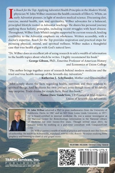 In Reach for the Top: Applying Adventist Health Principles in the Modern World, physician W. John Wilbur examines the health counsels of Ellen G. White, an early Adventist pioneer, in light of modern medical science. Discussing diet, exercise, mental health, rest, and spirituality, Wilbur advocates for a balanced, principled lifestyle rooted in Adventist teachings. He shares his personal journey applying these holistic principles, including recent struggles with heart disease. Throughout, Wilbur finds White's insights supported by current research, lending credibility to the Adventist emphasis on wholeness. Written accessibly, with a doctor's expertise, Reach for the Top provides inspiration and practical steps for pursuing physical, mental, and spiritual wellness. Wilbur makes a thoughtful case that true health aligns with God's natural laws. "Dr. Wilbur does an excellent job of using research to add a wealth of information to the health topics about which he writes. I highly recommend his book." ~ George Gibson, PhD Emeritus Professor of American History and Economics at Union College "The author brings together years of research behind modern medicine and the tried and true health message of the Seventh-day Adventists." ~ Katherine L. Schyllander, Mother and Grandmother "John simply shares the facts regarding health, nutrition and their relation to spiritual things. And he shares his own journey, even though some of its details may surprise. Trade drama for simple facts. Read this book!" ~ Pastor Dave VandeVere, VP-Finance at Mid-America Union of Seventh-day Adventists