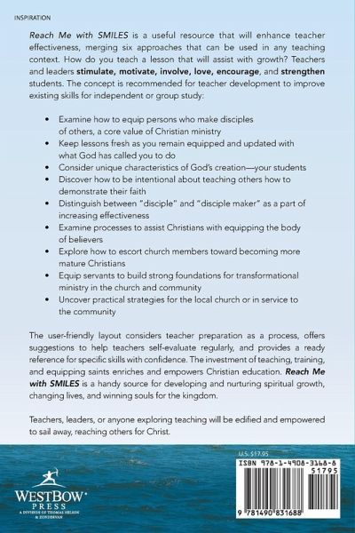 Reach Me with Smiles is a useful resource that will enhance teacher effectiveness, merging six approaches that can be used in any teaching context. How do you teach a lesson that will assist with growth? Teachers and leaders stimulate, motivate, involve, love, encourage, and strengthen students. The concept is recommended for teacher development to improve existing skills for independent or group study: ? Examine how to equip persons who make disciples of others, a core value of Christian ministry ? Keep lessons fresh as you remain equipped and updated with what God has called you to do ? Consider unique characteristics of God?s creation?your students ? Discover how to be intentional about teaching others how to demonstrate their faith ? Distinguish between ?disciple? and ?disciple maker? as a part of increasing effectiveness ? Examine processes to assist Christians with equipping the body of believers ? Explore how to escort church members toward becoming more mature Christians ? Equip servants to build strong foundations for transformational ministry in the church and community ? Uncover practical strategies for the local church or in service to the community The user-friendly layout considers teacher preparation as a process, offers suggestions to help teachers self-evaluate regularly, and provides a ready reference for specific skills with confidence. The investment of teaching, training, and equipping saints enriches and empowers Christian education. Reach Me with SMILES is a handy source for developing and nurturing spiritual growth, changing lives, and winning souls for the kingdom. Teachers, leaders, or anyone exploring teaching will be edified and empowered to sail away, reaching others for Christ.