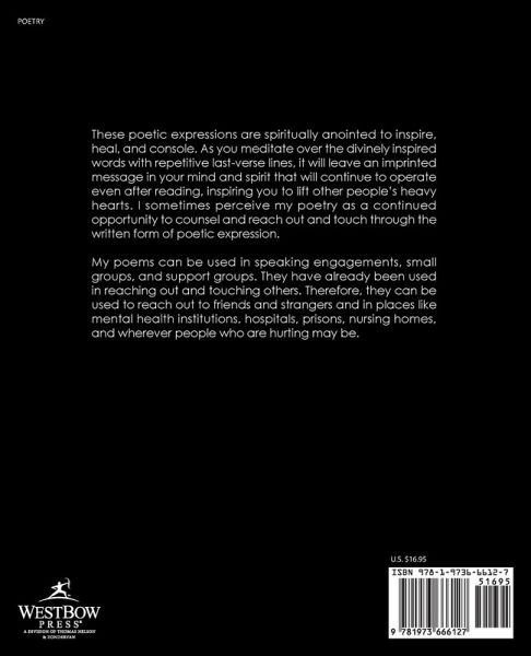 These poetic expressions are spiritually anointed to inspire, heal, and console. As you meditate over the divinely inspired words with repetitive last-verse lines, it will leave an imprinted message in your mind and spirit that will continue to operate even after reading, inspiring you to lift other people's heavy hearts. I sometimes perceive my poetry as a continued opportunity to counsel and reach out and touch through the written form of poetic expression. My poems can be used in speaking engagements, small groups, and support groups. They have already been used in reaching out and touching others. Therefore, they can be used to reach out to friends and strangers and in places like mental health institutions, hospitals, prisons, nursing homes, and wherever people who are hurting may be.