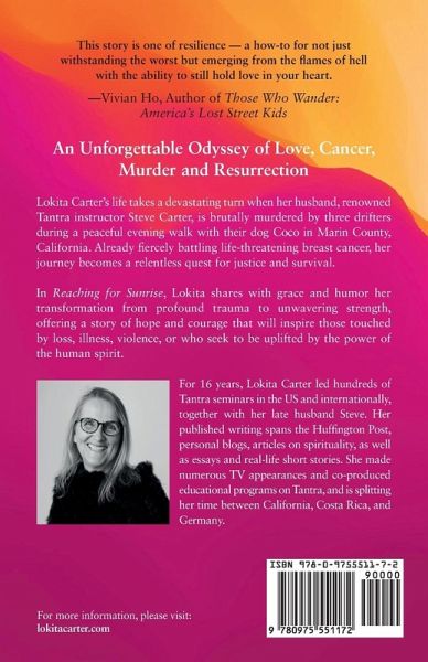 In the quiet corners of Marin County, California, a serene life is violently upheaved, leading one woman's battle against cancer to intertwine with a shocking crime that will test her spirit and redefine her path. Beyond the High-Profile Murder of Steve Carter When cancer threatened to claim her life, Lokita's fierce battle against the disease was only the beginning of her harrowing journey. As she fought to survive, her world shattered in a shocking act of violence that took the life of her beloved husband and renowned Tantra instructor, Steve Carter. Set against the backdrop of serene, affluent Marin County in Northern California, Lokita's life took an unexpected turn. On a tranquil early evening, Steve walked their dog, Coco, on a popular hiking trail. The peaceful community was rocked when Steve was brutally murdered, shot dead by three young homeless drifters, sending shockwaves far beyond their idyllic enclave and into the global media. Reaching for Sunrise is Lokita's powerful and poignant memoir, revealing the depths of her loss, her relentless pursuit of justice in the courtroom, and her simultaneous battle with aggressive breast cancer. With a quiet cadence, Lokita shares her extraordinary journey, interspersed with unexpected moments of humor and grace that illuminate her narrative. Readers will be swept away by Lokita's transformation of trauma into unwavering courage, allowing her to rise above the tragedy and rebuild her life. Reaching for Sunrise offers a delicate balance of hope and resilience, inviting those who have experienced loss, grappled with illness, confronted violent crime, or simply seek inspiration to embark on a heartfelt journey through the threads of love and courage that connect us all. From the brink of death to the quest for justice join Lokita's journey through love, loss, and rebirth. Get your copy today and discover how courage can shine through the darkest moments.