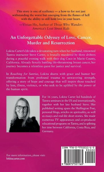 Beyond the High-Profile Murder of Steve Carter Unforgettable Odyssey of Love, Loss, and Resilience When cancer threatened to claim her life, Lokita's fierce battle against the disease was only the beginning of her harrowing journey. As she fought to survive, her world shattered in a shocking act of violence that took the life of her beloved husband and renowned Tantra instructor, Steve Carter. Set against the backdrop of serene, affluent Marin County in Northern California, Lokita's life took an unexpected turn. On a tranquil early evening, Steve walked their dog, Coco, on a popular hiking trail. The peaceful community was rocked when Steve was brutally murdered, shot dead by three young homeless drifters, sending shockwaves far beyond their idyllic enclave and into the global media. Reaching for Sunrise is Lokita's powerful and poignant memoir, revealing the depths of her loss, her relentless pursuit of justice in the courtroom, and her simultaneous battle with aggressive breast cancer. With a quiet cadence, Lokita shares her extraordinary journey, interspersed with unexpected moments of humor and grace that illuminate her narrative. Readers will be swept away by Lokita's transformation of trauma into unwavering courage, allowing her to rise above the tragedy and rebuild her life. Reaching for Sunrise offers a delicate balance of hope and resilience, inviting those who have experienced loss, grappled with illness, confronted violent crime, or simply seek inspiration to embark on a heartfelt journey through the threads of love and courage that connect us all.