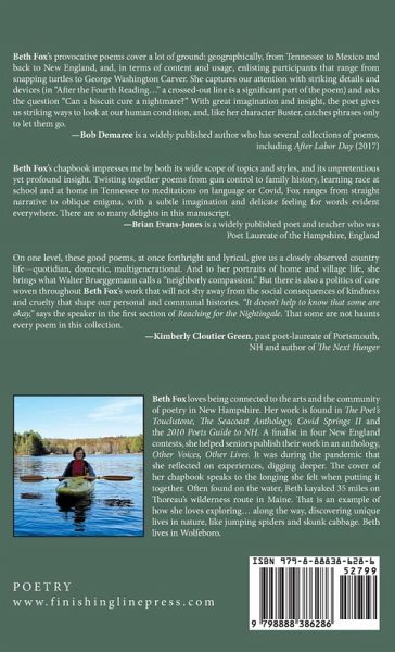 In her book Reaching for the Nightingale, Beth Fox covers a lot of ground: geographically, from Tennessee to Mexico and back to New England, and, in terms of content and usage, enlisting participants that range from snapping turtles to George Washington Carver. She captures our attention with striking details and devices. With great imagination and insight, the poet gives us striking ways to look at our human condition.