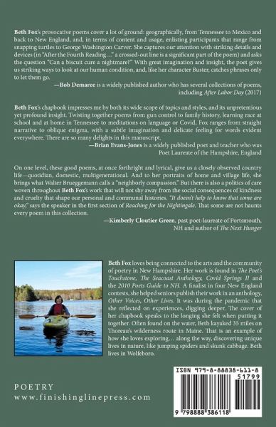 In her book Reaching for the Nightingale, Beth Fox covers a lot of ground: geographically, from Tennessee to Mexico and back to New England, and, in terms of content and usage, enlisting participants that range from snapping turtles to George Washington Carver. She captures our attention with striking details and devices. With great imagination and insight, the poet gives us striking ways to look at our human condition.