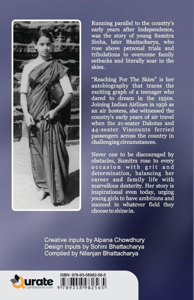 Running parallel to the country's early years after independence, was the story of young Sumitra Sinha, later Bhattacharya, who rose above personal trials and tribulations to overcome family setbacks and literally soar in the skies. "Reaching For The Skies" is her autobiography that traces the exciting graph of a teenager who dared to dream in the 1950s. Joining Indian Airlines in 1956 as an air hostess, she witnessed the country's early years of air travel when 21-seater Dakotas and 44-seater Viscounts ferried passengers across the country in challenging circumstances. Never one to be discouraged by obstacles, Sumitra rose to every occasion with grit and determination, balancing her career and family life with marvellous dexterity. Her story is inspirational even today, urging young girls to have ambitions and succeed in whatever field they choose to shine in.