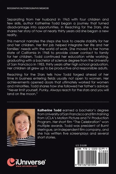 Separating from her husband in 1965 with four children and few skills, author Katherine Todd began a journey that turned disadvantage into opportunities. In Reaching for the Stars, she shares her story of how at nearly thirty years old she began a new reality. This memoir narrates the steps she took to create stability for her and her children. Her first job helped integrate her life and her family’s needs with the world of work. She moved to her home state of California in 1968 to provide closer contact to family for her children. Todd continued her education while working, graduating with a bachelor of science degree from the University of San Francisco in 1983, thirty years after high school graduation. Her children all grew up to be productive and responsible adults. Reaching for the Stars tells how Todd forged ahead of her time in business, entering fields usually not open to women. Her achievements opened doors that ultimately worked for women and minorities. Todd shares how she followed her father’s advice: "Never limit yourself, Punky. Always reach for the stars, and you will land on the moon."