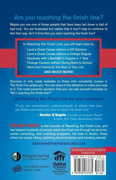 For some people, a goal is just a good idea. For others, a goal is a necessary requirement before one embarks on their quest. Most people are stuck in their jobs due to a lack of faith in their potential. "Reaching The Finish Line" shares research and discoveries on what hinders people from reaching their goals and what people can do to become successful achievers. You will learn several life changing opportunities that are rarely known by the public. *How To Find A Great Career Without A HS Diploma *How To Graduate With A Bachelor's Degree In 1 Year *How To Change Careers Without Going Back To College *How To Work From Home For The Rest Of Your Life *How To Make A 6 Figure Salary In Real Estate Without A License or Prior Experience "Reaching The Finish Line" includes in-depth chapters offering you a variety of career options, based on your preferences and current situation. If you have always wanted to become the person that you dreamed about, look no further for this is the book that will make the difference.