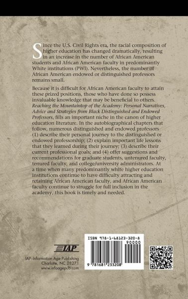 A volume in Contemporary Perspectives on Access, Equity and Achievement Series Editor: Chance W. Lewis, University of North Carolina at Charlotte Since the U.S. Civil Rights era, the racial composition of higher education has changed dramatically, resulting in an increase in the number of African American students and African American faculty in predominantly white institutions (PWI). Nevertheless, the number of African American endowed or distinguished professors remains small. Because it is difficult for African American faculty to attain these prized positions, those who have done so possess invaluable knowledge that may be beneficial to others. Reaching the Mountaintop of the Academy: Personal Narratives, Advice and Strategies from Black Distinguished and Endowed Professors, fills an important niche in the canon of higher education literature. In the autobiographical chapters that follow, numerous distinguished and endowed professors (1) describe their personal journey to the distinguished or endowed professorship; (2) explain important life lessons that they learned during their journey; (3) describe their current professional goals; and (4) offer suggestions and recommendations for graduate students, untenured faculty, tenured faculty, and college/university administrators. At a time when many predominantly white higher education institutions continue to have difficulty attracting and retaining African American faculty, and African American faculty continue to struggle for full inclusion in the academy, this book is timely and needed.