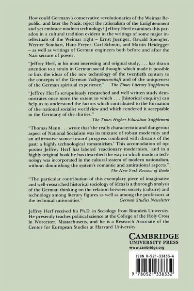 How could Germany's conservative revolutionaries of the Weimar Republic, and later the Nazis, reject the rationalism of the Enlightenment and yet embrace modern technology? Jeffrey Herf examines this paradox in a cultural tradition evident in the writings of some major intellectuals of the Weimar right - Ernst Juenger, Oswald Spengler, Werner Sombart, Hans Freyer, Carl Schmitt, and Martin Heidegger - as well as writings of German engineers both before and after the Nazi seizure of power.