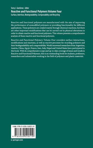 Reactive and Functional Polymers Volume Four considers surface interactions, modifications and reactions, as well as reactive processes for recycling polymers and their biodegradability and compostability. World renowned researchers from Argentina, Austria, China, Egypt, France, Iran, Italy, Nepal and United States have participated in this book. With its comprehensive scope and up-to-date coverage of issues and trends in Reactive and Functional Polymers, this is an outstanding book for students, professors, researchers and industrialists working in the field of polymers and plastic materials.