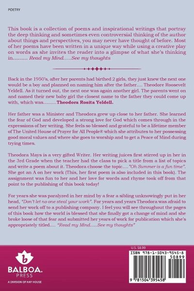 This book is a collection of poems and inspirational writings that portray the deep thinking and sometimes even controversial thinking of the author about things and perspectives, you may never have thought of before. Most of her poems have been written in a unique way while using a creative play on words as she invites the reader into a glimpse of what shes thinking in Read my Mind..See my thoughts
