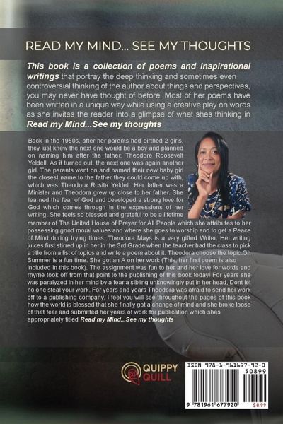This book is a collection of poems and inspirational writings that portray the deep thinking and sometimes even controversial thinking of the author about things and perspectives, you may never have thought of before. Most of her poems have been written in a unique way while using a creative play on words as she invites the reader into a glimpse of what shes thinking in Read my Mind..See my thoughts