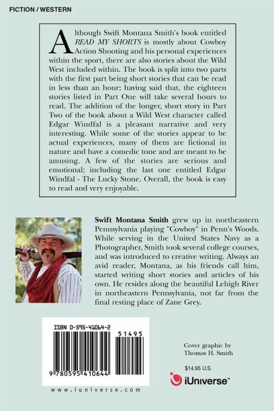 READ MY SHORTS is a collection of short stories written mostly about the subject of Cowboy Action Shooting, with stories of the Wild West intermingled within the book. Most of the stories can be read in a short time, which makes this book a great traveling companion. Although Mr. Smith's intent is not to make any political statements, the book can be labeled Politically Uncorrect because he pulls no punches about the way he feels on certain subjects. Far from being a 'tech manual', Mr. Smith writes from a personal aspect about the fastest growing sport in America called Cowboy Action Shooting. The result is sometimes hilarious and at other times, serious and heart felt. The book is written in easy to read, everyday language and can be read by just about any age group. There is no delineation for race or ethnicity so the book will do just as well sitting in the book rack at a doctor's office as well as being read around the campfire by a family while on vacation. Since the Wild West and Cowboys are something that are truly an American invention, anyone claiming to be a Great American will enjoy this book and will want to read the stories to themselves, as well as to their children, family, and friends.