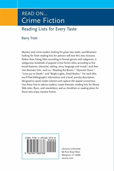 Mystery and crime readers looking for great new reads, and librarians looking for fresh reading lists for patrons will love this new resource. It categorizes hundreds of popular crime fiction titles according to five broad features: character, setting, story, language and mood-and then into thematic lists as Reading the Bones, Dynamic Duos, Love you to Death, and Bright Lights, Dead Bodies. For each title, you'll find bibliographic information and a brief, punchy description, designed to spark reader interest. Use these lists to advise readers; create thematic reading lists for library Web sites, flyers, and newsletters; and as checklists or reading plans for those who enjoy mystery fiction. Buy two copies-one for the reference or readers' advisory resource shelf and another to circulate!