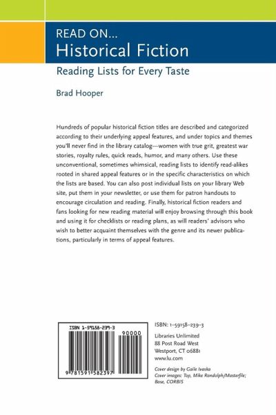 Hundreds of popular historical fiction titles are described and categorized according to their underlying appeal features, and under topics and themes you'll never find in the library catalog-women with true grit, greatest war stories, royalty rules, quick reads, humor, and many others. Use these unconventional, sometimes whimsical, reading lists to identify read-alikes rooted in shared appeal features or in the specific characteristics on which the lists are based. You can also post individual lists on your library Web site, put them in your newsletter, or use them for patron handouts to encourage circulation and reading. Historical fiction readers and fans looking for new reading material will enjoy browsing through this book and using it for checklists or reading plans. Readers' advisors who wish to better acquaint themselves with the genre and its newer publications, particularly in terms of appeal features, will find it useful as well A great new approach to one of today's hottest genres -historical fiction. Hooper categorizes and describes hundreds of popular historical fiction titles-not according to places or time periods or subgenres, but according to their underlying appeal features, and under topics and themes you'll never find in the library catalog-women with true grit, greatest war stories, the corridors of power, royalty rules, humor, nostalgic and elegiac historical fiction, quick reads, history's forgotten heroes, and many others. More than 400 of the best and most current historical fiction titles are covered, with some popular classics also included. For each title, there is bibliographic information and a lively plot summary designed to spark reader interest. These unconventional, sometimes whimsical, reading lists can be used to identify read-alikes rooted in shared appeal features or in the specific characteristics on which the lists are based. You can post specific lists on your library Web site, put them in your newsletter, or use them for patron handouts to encourage circulation and reading. Historical fiction readers and fans looking for new reading material will enjoy browsing through this book and using it for checklists, reading plans, or as a book club resource. Readers' advisors who wish to better acquaint themselves with the genre and its newer publications, particularly in terms of appeal features, will find it useful as well. In fact, libraries will want to order multiple copies-one for the readers' advisor and reference desk, and one for the circulating collection.
