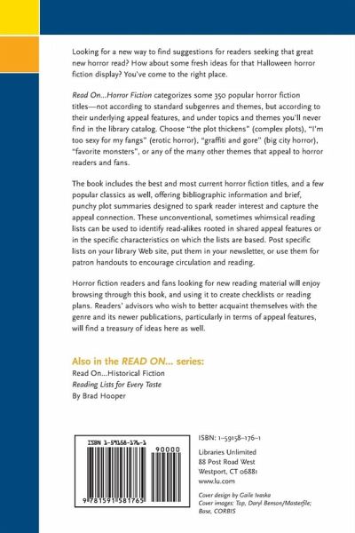 Hundreds of popular horror fiction titles are described and categorized according to their underlying appeal features, and under topics and themes you'll never find in the library catalog: the plot thickens (complex plots), fear factors (truly terrifying), big city horror, over-the-top weirdos, and many other themes that appeal to horror readers and fans. Use these unconventional, sometimes whimsical reading lists to identify read-alikes rooted in shared appeal features or in the specific characteristics on which the lists are based. Post individual lists on your library Web site, put them in your newsletter, or use them for patron handouts to encourage circulation and reading. Horror fiction readers and fans looking for new reading material will enjoy browsing through this book and using it to create checklists or reading plans. Readers' advisors who wish to better acquaint themselves with the genre and its newer publications, particularly in terms of appeal features, will find a treasury of ideas here as well. Looking for a new way to find suggestions for readers seeking that great new horror read? How about some fresh ideas for that Halloween horror fiction display? You've come to the right place. Read On.Horror Fiction categorizes hundreds of popular horror fiction titles-not according to standard subgenres and themes, but according to their underlying appeal features, and under topics and themes you'll never find in the library catalog. Choose the plot thickens (complex plots), I'm too sexy for my fangs (erotic horror), graffiti and gore (big city horror), favorite monsters, or any of the many other themes that appeal to horror readers and fans. The book includes approximately 350 of the best and most current horror fiction titles, and a few popular classics as well, offering bibliographic information and brief, punchy plot summaries designed to spark reader interest and capture the appeal connection. These unconventional, sometimes whimsical reading lists can be used to identify read-alikes rooted in shared appeal features or in the specific characteristics on which the lists are based. Post specific lists on your library Web site, put them in your newsletter, or use them for patron handouts to encourage circulation and reading. Horror fiction readers and fans looking for new reading material will enjoy browsing through this book, and using it to create checklists or reading plans. Readers' advisors who wish to better acquaint themselves with the genre and its newer publications, particularly in terms of appeal features, will find a treasury of ideas here as well. Libraries may wish to order multiple copies-one for the readers' advisor and reference desk and one to the circulating collection. desk, and one for the circulating collection.