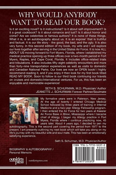Is it an exciting novel? Is it instructional? Is it about self-improvement? Is it a great cookbook? Is it about romance and lust? Is it about horror and crime? Are we celebrities or famous authors? It is none of these things. What it is, is an autobiography about us. It is an expose' that is truthful and factual. It is our life story - the good, the bad, and the ugly. It is also very funny. In this second edition of my book, my wife and I will explore our lives together after serving in the United States Air Force. It is now ALL ABOUT US moving forward to Fort Myers, Florida, where I established my medical practice opening up three offices over a two-month period in Fort Myers, Naples, and Cape Coral, Florida. It Includes office-related trials and tribulations. It also includes fifty-eight celebrity encounters and more than forty-nine transportation experiences as well as visits to domestic and Canadian National Parks. Our lives are now an OPEN book! I highly recommend reading it, and if you enjoy it then look for my first book titled READ MY BOOK. Soon to follow is our third book continuing our travels on cruises and domestic/international ventures. For us, this has been an enjoyable and memorable experience! SETH S. SCHURMAN, M.D. - Physician/ Author JEANETTE J. SCHURMAN - Forever Partner/Soulmate