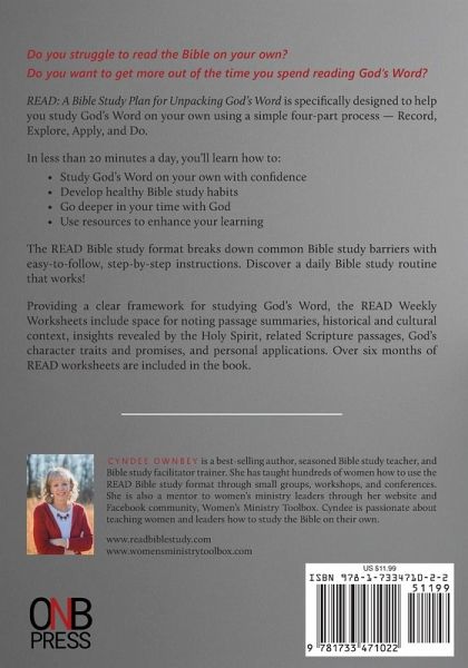 Do you struggle to read the Bible on your own? Do you want to get more out of the time you spend reading God's Word? READ: A Bible Study Plan for Unpacking God's Word is specifically designed to help you study God's Word on your own using a simple four-part process - Record, Explore, Apply, and Do. In less than 20 minutes a day, you'll learn how to:Study God's Word on your own with confidence Develop healthy Bible study habits Go deeper in your time with God Use resources to enhance your learning The READ Bible study format breaks down common Bible study barriers with easy-to-follow, step-by-step instructions. Discover a daily Bible study routine that works! Providing a clear framework for studying God's Word, the READ Weekly Worksheets include space for noting passage summaries, historical and cultural context, insights revealed by the Holy Spirit, related Scripture passages, God's character traits and promises, and personal applications. Over six months of READ worksheets are included in the book. Cyndee Ownbey is a best-selling author, seasoned Bible study teacher, and Bible study facilitator trainer. She has taught hundreds of women how to use the READ Bible study format through small groups, workshops, and conferences. She is also a mentor to women's ministry leaders through her website and Facebook community, Women's Ministry Toolbox. Cyndee is passionate about teaching women and leaders how to study the Bible on their own.