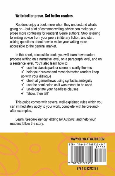 Write better prose. Get better readers. Readers enjoy a book more when they understand what's going on-but a lot of common writing advice can make your prose more confusing for readers! Genre authors: Stop listening to writing advice from your peers in literary fiction, and start asking questions about how to make your writing more accessible to the general market. In this short, accessible book, you will learn how readers process writing on a narrative level, on a paragraph level, and on a sentence level. You'll also learn how to:use the classic parlour scene to clarify more than just murder help your busiest and most distracted readers keep up with your dialogue cheat your way through gameshows using syntactic ambiguity use the semi-colon as it was actually meant to be used un-decapitate your headless clauses "show, then tell" This guide comes with several well-explained rules which you can immediately apply to your work, complete with before-and-after examples. Learn Reader-Friendly Writing for Authors, and help your readers follow the story.