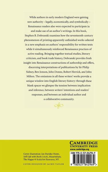 While authors in early modern England were gaining new authority - legally, economically and symbolically - Renaissance readers also were expected to participate in and make use of an author's writings. In this book, Stephen B. Dobranski examines how the seventeenth-century phenomenon of printing apparently unfinished works ushered in a new emphasis on authors' responsibility for written texts while it simultaneously reinforced Renaissance practices of active reading. Bringing together textual studies, literary criticism and book trade history, Dobranski provides fresh insight into Renaissance constructions of authorship and offers discerning interpretations of publications by Sir Philip Sidney, Ben Jonson, John Donne, Robert Herrick and John Milton. The omissions in all these writers' works provide a unique window into English literary history: through these blank spaces we glimpse the tension between implication and inference, between writers' intentions and readers' responses and between an individual author and a collaborative community.