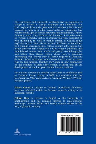 The eighteenth and nineteenth centuries saw an explosion in Europe of interest in foreign languages and literatures. This book explores how early generations of women writers formed connections with each other across national boundaries. The volume sheds light on female networks spanning Britain, France, Germany, Spain, Italy, Holland and Denmark. It includes essays on 'virtual' networks, that is, on women who read, translated or were inspired by the work of women abroad, as well as essays exploring actual links between writers of different nationalities, be it through correspondence, visits or contact in the salons. The essays gathered here engage with a wide range of published and unpublished sources, from novels and poetry to autobiography and letters. They discuss writers whose work is becoming increasingly well known, such as Maria Edgeworth, Germaine de Staël, Rahel Varnhagen and George Sand, as well as those who are less familiar. Together, they open up new perspectives onthe activities of these early women of letters and on the development of the European female literary tradition.