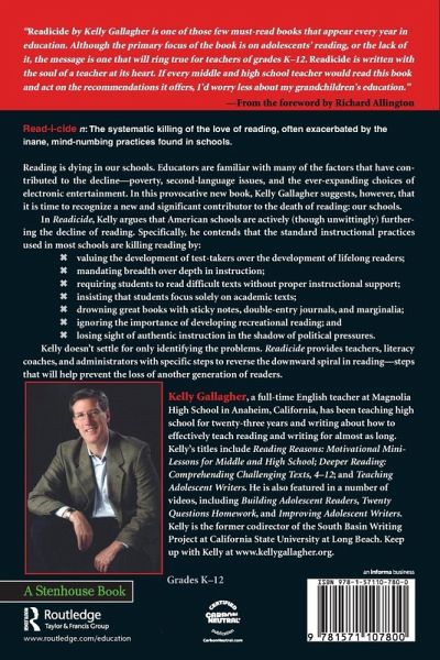Read-i-cide n: The systematic killing of the love of reading, often exacerbated by the inane, mind-numbing practices found in schools. Reading is dying in our schools.