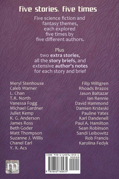Five stories, five times Five science fiction and fantasy themes, each explored five times by five different authors. Twenty-five great authors demonstrating just how varied and interesting SF&F can be, and how each author's style and approach make all the difference. This special Writers' Edition has all the above, plus two extra stories, the original story briefs, and extensive author notes for each story and each brief. 100 pages of extra material specifically intended for writers! Contents Contemporary Fantasy Dreaming in Other Colours — Meryl Stenhouse Letters to the Earth — Caleb Warner The Fourth Pillar Says No — L. Chan Howl at the Moon — T.R. North Kitchen — Vanessa Fogg The Simple Task — Michael Gardner Soft Science Fiction Time, The Ever-Rolling Stream — Juliet Kemp Patience — K. G. Anderson Petri Viventum — James Ross The Great Scientist Rivalry on Sourdough — Beth Goder The Visible Spectrum — Matt Thompson Other The Fragments of Others — Suzanne J. Willis Between Ashes and Wings — Chanel Earl 1001 — Y. X. Acs Where Art Thou, My Love? — Filip Wiltgren Deus ex Noir — Rhoads Brazos Maps in Our Footsteps, Legend in Our Dreams — Jason Baltazar Hard Science Fiction T-Minus — Ian Rennie Countdown — David Hammond One of the Cities — Damien Krsteski In the Absence of Time — Pauline Yates The Long View — Karl Dandenell High Fantasy Blood Feud — Paul A. Hamilton Child of Flowers — Sean R. Robinson Tongue of the Chimera — Sandi Leibowitz Song and Sacrifice — Rob Francis The Gentlest River — Karolina Fedyk The briefs Contemporary Fantasy — Meryl Stenhouse Soft SF — Beth Goder Other — Y.X.Acs Hard SF — Karl Dandenell High Fantasy — Sean R. Robinson Sample brief — B. Morris Allen
