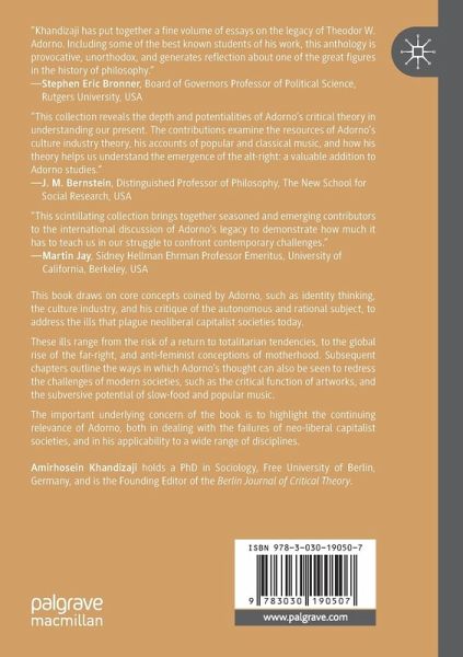 This book draws on core concepts coined by Adorno, such as identity thinking, the culture industry, and his critique of the autonomous and rational subject, to address the ills that plague neoliberal capitalist societies today. These ills range from the risk of a return to totalitarian tendencies, to the global rise of the far-right, and anti-feminist conceptions of motherhood. Subsequent chapters outline the ways in which Adorno's thought can also be seen to redress the challenges of modern societies, such as the critical function of artworks, and the subversive potential of slow-food and popular music. The important underlying concern of the book is to highlight the continuing relevance of Adorno, both in dealing with the failures of neo-liberal capitalist societies, and in his applicability to a wide range of disciplines.