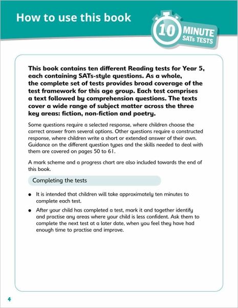 Just like the real thing - only shorter! Help your child preparefor the SATS with these bite-sized National test papers. This bookoffers ten complete mini-reading tests which include fiction, non-fictionand poetry texts. Question types and mark schemes matchthe format of the National tests.