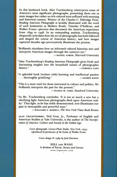 Winner of the Charles C. Eldredge Prize In this book, Alan Trachtenberg reinterprets some of America's most significant photographs, presenting them not as static images but rather as rich cultural texts suffused with meaning and historical content. Reading American Photographs is lavishly illustrated with the work of such luminaries as Mathew Brady, Timothy O'Sullivan, and Walker Evans--pictures that document the American experience from 1839 to 1938. In an outstanding analysis, Trachtenberg eloquently articulates how the art of photography has both followed and shaped the course of American history, and how images captured decades ago provocatively illuminate the present.