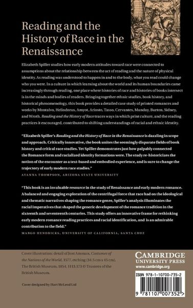 Elizabeth Spiller studies how early modern attitudes towards race were connected to assumptions about the relationship between the act of reading and the nature of physical identity. As reading was understood to happen in and to the body, what you read could change who you were. In a culture in which learning about the world and its human boundaries came increasingly through reading, one place where histories of race and histories of books intersect is in the minds and bodies of readers. Bringing together ethnic studies, book history and historical phenomenology, this book provides a detailed case study of printed romances and works by Montalvo, Heliodorus, Amyot, Ariosto, Tasso, Cervantes, Munday, Burton, Sidney and Wroth. Reading and the History of Race traces ways in which print culture and the reading practices it encouraged, contributed to shifting understandings of racial and ethnic identity.