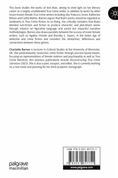 This book studies the works of Ann Rule, aiming to shed light on her literary career as a largely uncelebrated True Crime writer, in addition to works by other lesser-known female True Crime writers including Alia Trabucco Zerán, Katherine Ellison and Caitlin Rother. Barnes argues that Rule s works should be regarded as landmarks in True Crime fiction. In so doing, she critically considers how Rules blended non-fiction and fiction to produce character- and plot-driven works through reliance on figurative language and varied but impactful narrative methodologies. Barnes also draws parallels between the success of iconic female writers, such as Agatha Christie and Dorothy L. Sayers, in the Golden Age of detective and crime fiction and considers the similarities, differences and connections between these genres.