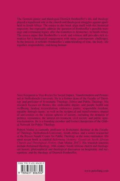 The German pastor and theologian Dietrich Bonhoeffer's life and theology played a significant role in the church and theological struggles against apartheid in South Africa. The essays in this book align itself with this historical trajectory, but especially address the question of Bonhoeffer's possible message and continuing legacy after the transition to democracy in South Africa. The essays argue that Bonhoeffer's work and witness still provides rich resources for a theological engagement with more contemporary challenges. In the process, it rethinks Bonhoeffer's understanding of time, the body, life together, responsibility, and being human.