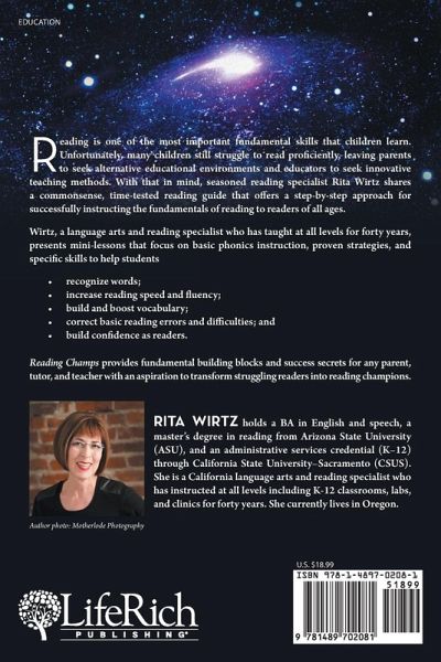 Reading is one of the most important fundamental skills that children learn. Unfortunately, many children still struggle to read proficiently, leaving parents to seek alternative educational environments and educators to seek innovative teaching methods. With that in mind, seasoned reading specialist Rita Wirtz shares a commonsense, time-tested reading guide that offers a step-by-step approach for successfully instructing the fundamentals of reading to readers of all ages. Wirtz, a language arts and reading specialist who has taught at all levels for forty years, presents mini-lessons that focus on basic phonics instruction, proven strategies, and specific skills to help students ¿ recognize words; ¿ increase reading speed and fluency; ¿ build and boost vocabulary; ¿ correct basic reading errors and difficulties; and ¿ build confidence as readers. Reading Champs provides fundamental building blocks and success secrets for any parent, tutor, and teacher with an aspiration to transform struggling readers into reading champions.