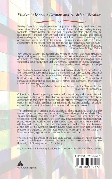 «Reading Colour is a hugely ambitious project: in asking why and how poets write colour, Rey Conquer offers a tour de force of close reading in early twentieth-century poetry, but also tells a fascinating story about how we read poetry - indeed, how we read. Full of fascinating insights and brilliant close readings - from George's surfaces to Rilke's balance, Kandinsky's red corners and Lasker-Schüler's blue rooms - this is a stunning guide to the inner architecture of the poem from the first to the last gorgeously written page.» (Karen Leeder, Professor of Modern German Literature, Fellow of New College, Oxford)
