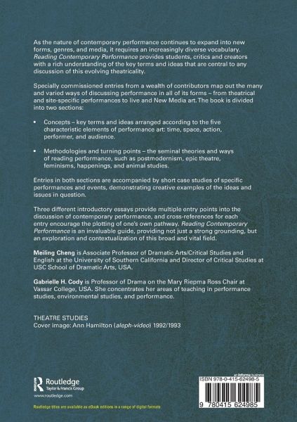 As the nature of contemporary performance continues to expand into new forms, genres and media, it requires an increasingly diverse vocabulary. Reading Contemporary Performance provides students, critics and creators with a rich understanding of the key terms and ideas that are central to any discussion of this evolving theatricality. Specially commissioned entries from a wealth of contributors map out the many and varied ways of discussing performance in all of its forms - from theatrical and site-specific performances to live and New Media art. The book is divided into two sections: Concepts - Key terms and ideas arranged according to the five characteristic elements of performance art: time; space; action; performer; audience. Methodologies and Turning Points - The seminal theories and ways of reading performance, such as postmodernism, epic theatre, feminisms, happenings and animal studies. Case Studies - entries in both sections are accompanied by short studies of specific performances and events, demonstrating creative examples of the ideas and issues in question. Three different introductory essays provide multiple entry points into the discussion of contemporary performance, and cross-references for each entry also allow the plotting of one's own pathway. Reading Contemporary Performance is an invaluable guide, providing not just a solid set of familiarities, but an exploration and contextualisation of this broad and vital field.